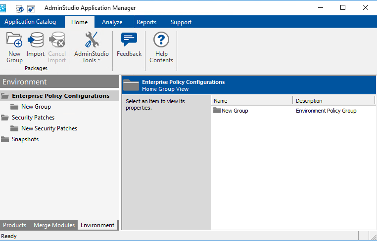 Hometab on the Application Manager ribbon. - Click on the Environment tab. The tree lists the Security Patches, OS Snapshots, and Enterprise Policy Configuration files that have already been imported into the Application Catalog.