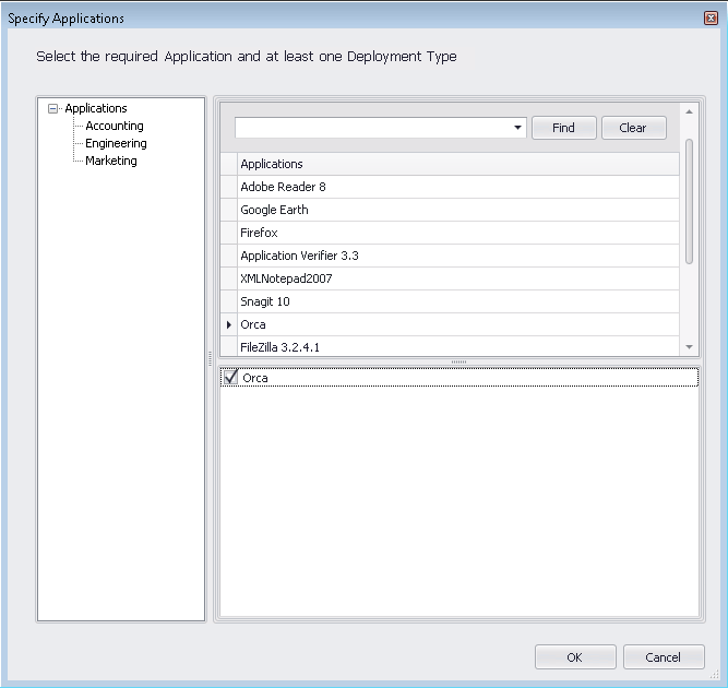 | Deployment type list | When an application is selected in the Applications list, that application’s App-V 5.0 deployment type is listed in the lower pane. Select the App-V 5.0 deployment type that you want to add to the virtual environment and click OK. If the selected application does not contain any App-V 5.0 packages, nothing is listed in the Deployment type list. |