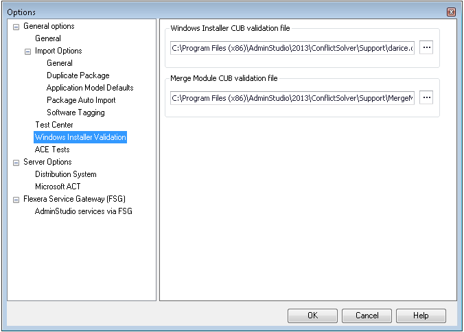 | Windows Installer CUB validation file | The file specified in this field contains the Internal Consistency Evaluators (ICEs) that will be used for validation of Windows Installer packages. Either enter the location of this file directly, or use the Browse button (...) to locate it. |