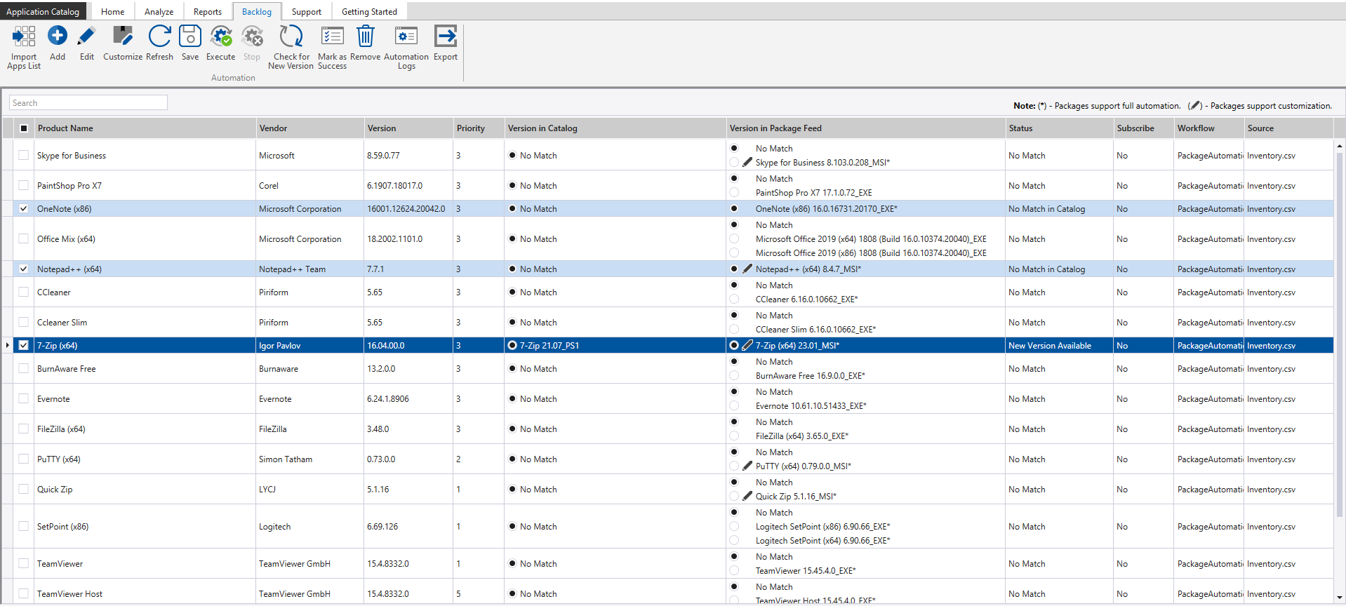 Column Description Product Name Name of application. Vendor Vendor of application. Version Version of application. Priority Priority of application. This column has 5 values, were you can select the value as per the priority of the package. The default value of the Priority will be 3. Version in Catalog This column displays the matching package entries in the Application Catalog for the applications in the list. Depending on AdminStudio's automatic matching, this column may have single or multiple matching entries. By default, the matching will be set to No Matchfor all the applications. If no matching packages are found in the catalog, then the column will list no packages. Supported package types include .exe, .msi, and .ps1. The package entry is displayed in the format: ProductName_Version_SetupType, to help easy matching. Example: 7-Zip_19.00.00_MSI. This column has two filter values: Matches available : selects the inventory package having at least one matching package in Version in Catalog column. Matches not available : selects the inventory package having which has no matching package in Version in Catalog column.Version in Package Feed This column displays the matching package entries in the Package Feed Module for the applications in the list. Depending on AdminStudio's automatic matching, this column may have single or multiple matching entries. The versions of the packages displayed will be always equal to or greater than the version of the listed application. This helps you know if there is a newer (and latest) version available in Package Feed Module. By default, the matching will be set to No Matchfor all the applications. If no matching packages are found in the Package Feed Module, then the column will list no packages. Supported package types include .exe and .msi. The package entry is displayed in the format: ProductName_Version_SetupType, to help easy matching. Example: 7-Zip_19.00.00_MSI_IgorPavlov. This column has two filter values: Matches available : selects the inventory package having at least one matching package in the Version in Package Feed column. Matches not available : selects the inventory package having which has no matching package in the Version in Package Feed column.Status After the apps list is imported into Application Catalog, AdminStudio assigns No Matchstatus to all the applications by default. Select the matching entry in theVersion in CatalogandVersion in Package Feedcolumns and click onSave. Upon clicking onSave, AdminStudio will automatically change the status of the applications based on the selections made inVersion in CatalogandVersion in Package Feedcolumns. Here is the of all the possible status of an application: No Match —Indicates No Match is selected, for an application, in both the Version in Catalog and Version in Package Feed columns. No Match in Catalog —Indicates an appropriate matching package entry is found and selected in the Version in Package Feed column (Package Feed Modules packages) but there is no matching package entry found and No Match is selected in the Version in Catalog column. No Match in Package Feed —Indicates an appropriate matching package entry in found and selected in the Version in Catalog column but there is no matching package entry found and No Match is selected in the Version in Package Feed column. New Version Available —A matching package for an application is found and selected in the Version in Catalog (in Application Catalog) and Version in Package Feed (in Package Feed Module) columns. When the selected package is Version in Package Feed has the version newer (or greater) than package entry selected in the Version in Catalog , then the status is set to New Version Available. This status indicates that a new version of an application is available in Package Feed Module as compared to the version in catalog. Success —After When a new version of an application is available in Package Feed Module, the next step will be to get this new version in the Application Catalog through various pre-configured actions like import, test etc. Once all the pre-configured actions are executed successfully on the newly available version, then the status of this application will be set to Success . If any of the pre-configured actions fail, then the status would be set appropriately. Example if Import action fails, then the status will be Import Failed. An application's status, which has matching package entry in Version in Package Feed , will be reset to New Version Available from its current status, whenever a new version of this application is available in Package Feed Module.Subscribe Package Automation executes a set of pre-configured actions when a new version of a package is available in Package Feed Module. If you want to subscribe any application for automation, then set Subscribe to Yes. IfNo Matchis selected in theVersion in Package Feedcolumn, then subscribing an application for the Automation is not allowed.Workflow Lists the pre-configured automation workflows in the drop-down. Select a workflow to assign to a package request. The assigned automation workflow will be executed on a new version of the package when automation is triggered based on your configured schedule and when manual execution is triggered by clicking the Executebutton. For more information, see Configuring Automation Workflows for Package Automation.Source Lists the name of the imported CSV file that contained this application.