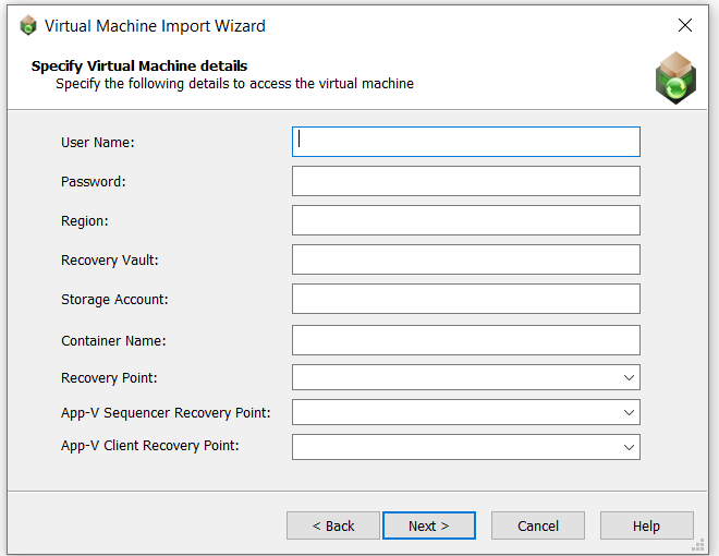 Virtual Machine Source Steps to Take Microsoft Hyper-V Server On the Specify Microsoft Hyper-V Serverpanel, specify Microsoft Hyper-V server name and credentials to browse for virtual machines: Server Name—Enter the server name of the Microsoft Hyper-V Server that you want to connect to. Authentication—Select Windows Authentication if you want to use the credentials of the logged in user to login to the Hyper-V Server. Select Server Authentication if you want to connect to the Hyper-V Server using the specified User name and Password .VMware ESX or ESXi Server On the Specify VMWare ESX or ESXi Serverpanel, specify VMWare ESX or ESXi server name and credentials to browse for virtual machines: Server Name—Enter the name of the VMware ESX or ESXi server. User name—Enter the login ID for the VMware ESX or ESXi server. Password—Enter the password for the VMware ESX or ESXi server.Azure Virtual Machines On the Specify Azure Detailspanel, specify the following details to connect to Azure to browse the virtual machines: Azure Environment—Select either: Global— Choose this option if you want to set azure environment as a global environment. US Government— Choose this option if you want to set azure environment as a US government environment. Application (client) ID—Enter the registered client id. For more information, see App Registration. Client Secret—Enter the client secret id. For more information, see Create Client Secret. Directory (tenant) ID—Enter the registered tenant id. For more information, see App Registration. Subscription ID—Enter the valid subscription id. For more information, see Subscription Details. Resource Group—Enter the resource group where all resources will be included. For more information, see Create Resource Groups.Browse local machine On the Select Virtual Machinespanel, do one of the following: To add an individual virtual machine: Click Browse Files . The Select Virtual Machine Image File dialog box opens. Select the virtual machine image you want to add to the project and click <span class="UI_Element">Open</span>. To add all of the virtual machines in a specific directory: Click Browse Folders . The Browse for Folder dialog box opens. Select a directory that contains the virtual machine images that you want to add to your project and click <span class="UI_Element">OK</span>.- When you have finished this step, the virtual machines will be listed (but not selected) on the Select Virtual Machines panel.