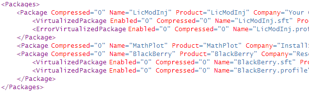 | Packages | The <Packages> element contains multiple <Package> elements, which identify the packages that you have added to the project:![]() Each <Package> element can have multiple <RepackagedPackage>, <VirtualizedPackage>, and <ErrorVirtualizedPackage> elements. |