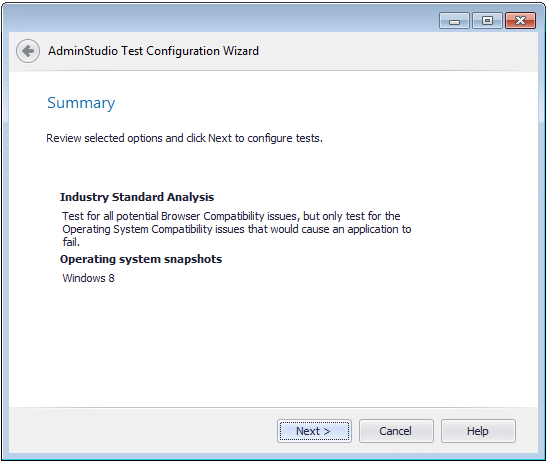| Application Conflicts Application Virtualization Compatibility Best Practices Risk Assessment Remote Application Publishing Compatibility | Test selection in these test categories are not affected by any selections made in the AdminStudio Test Configuration Wizard. |