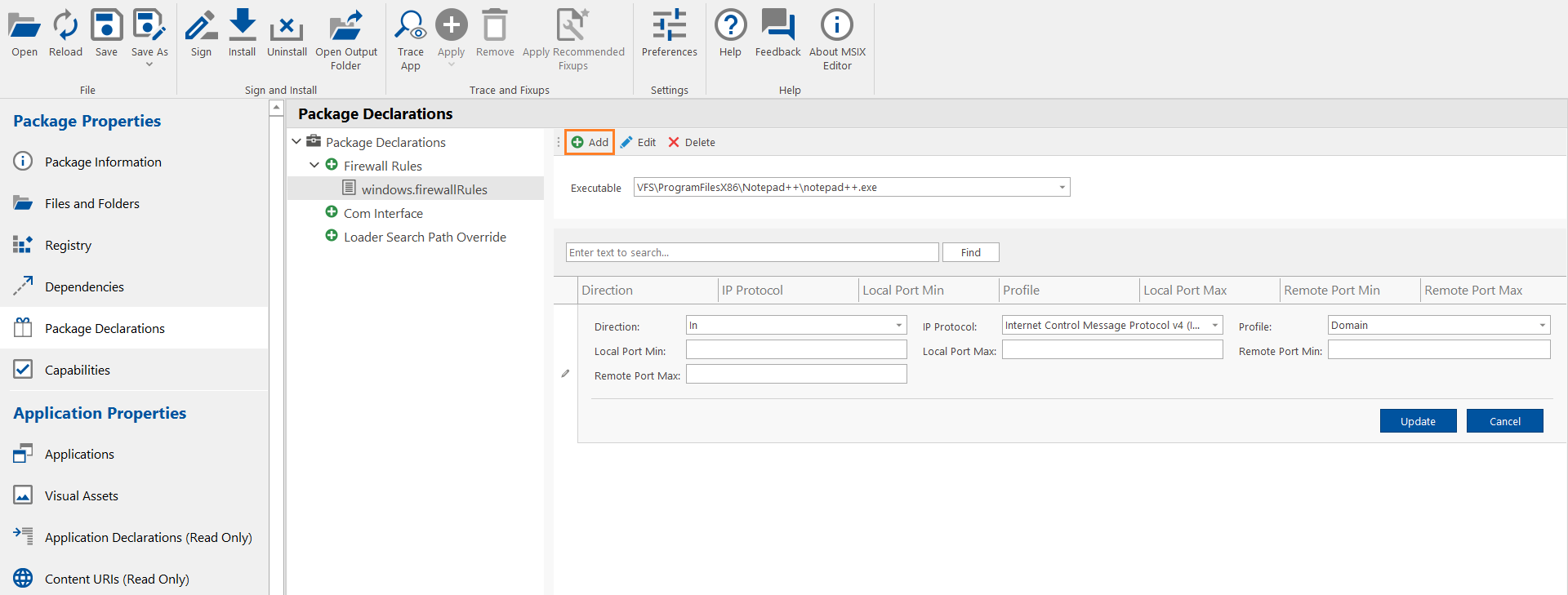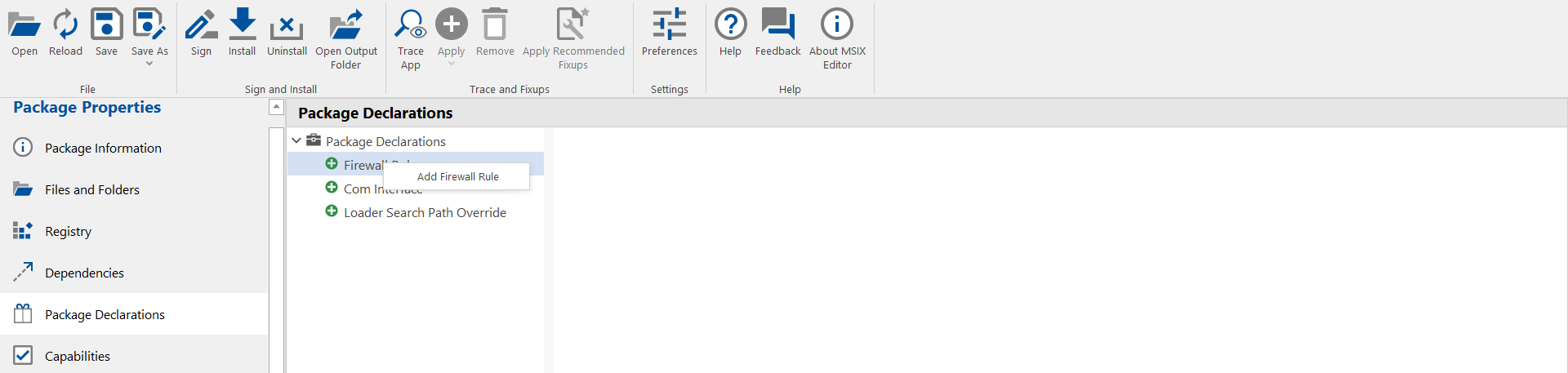 2. In the Package Declarations pane, right-click on any declaration where you want to add properties, and then click on Add Rule as appropriate.