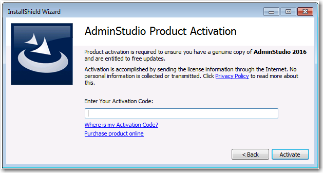 Select Activate or Purchase AdminStudio and click Next. The AdminStudio Product Activation dialog box opens, and you are prompted to Enter Your Activation Code.