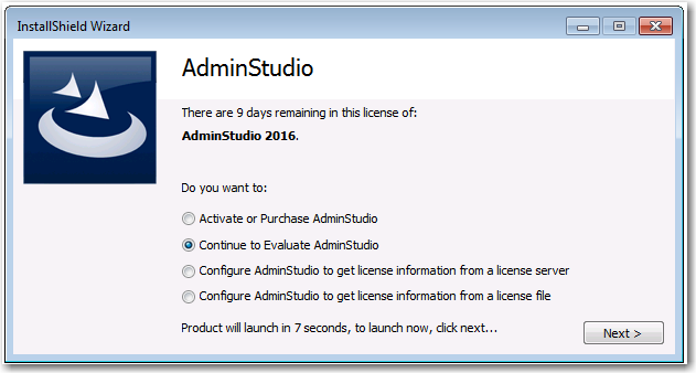 Launch AdminStudio ZENworks Edition. The following dialog box opens, prompting you to either activate or evaluate AdminStudio.