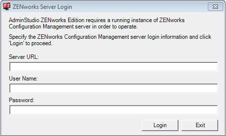 Click Finish. AdminStudio launches. You will then be prompted to log in to a ZENworks Configuration Management server on the ZENworks Server Login dialog box.